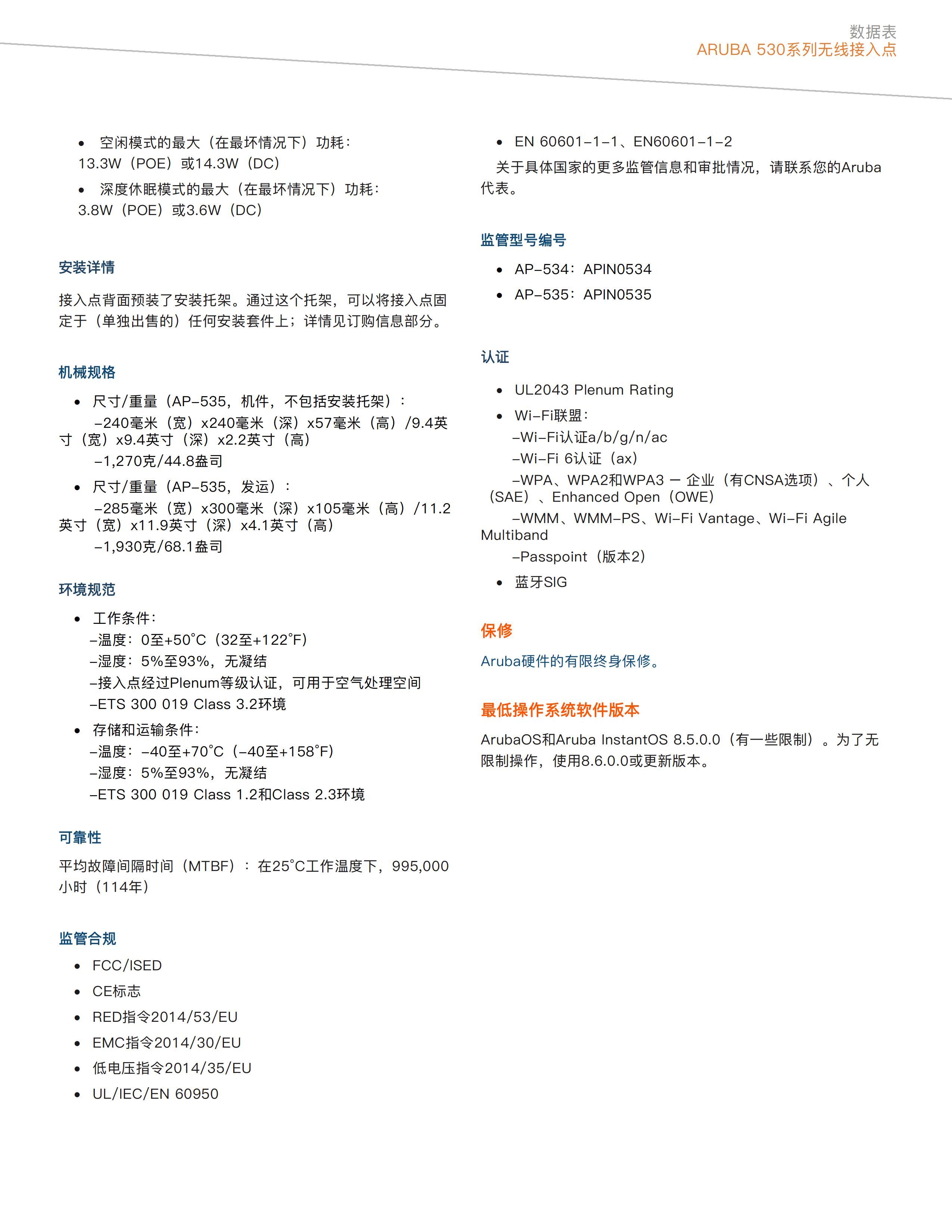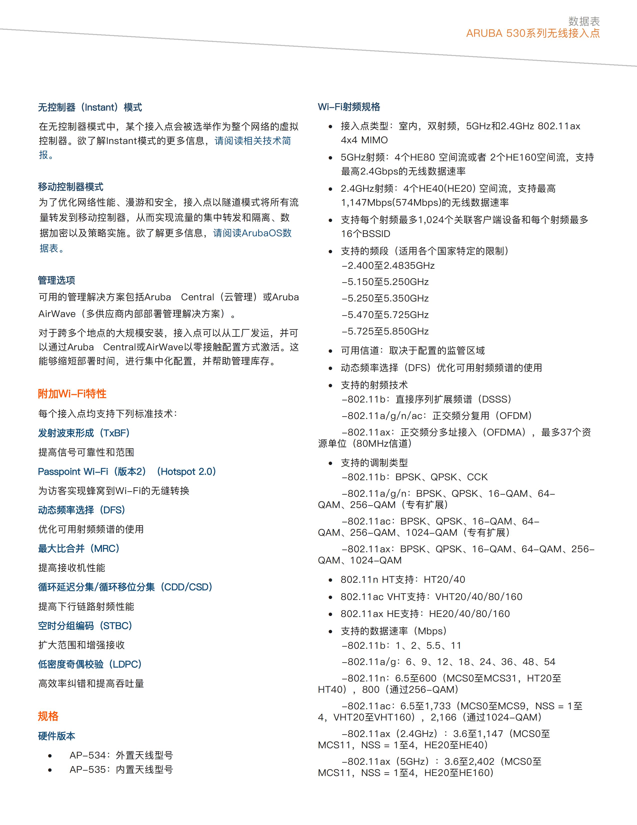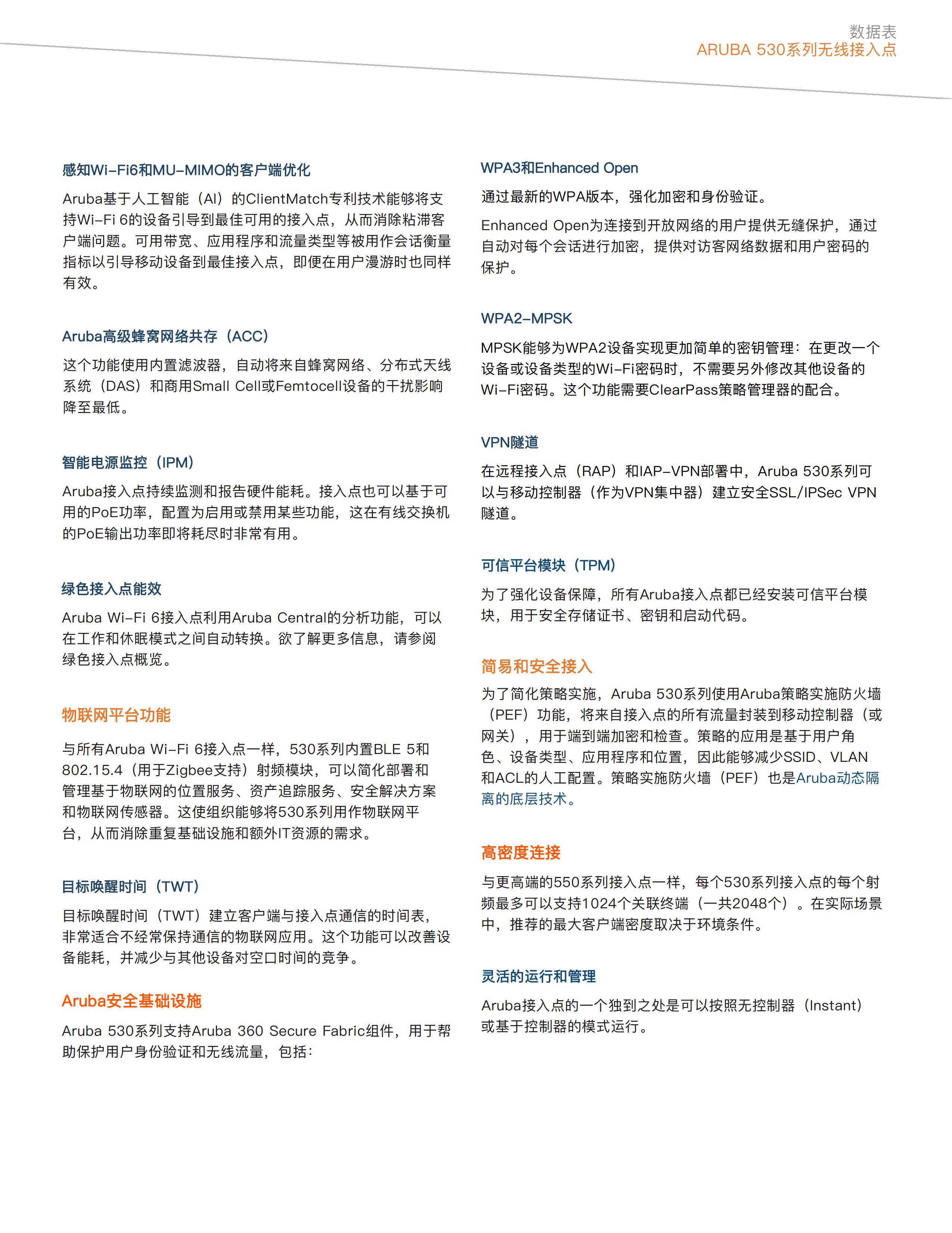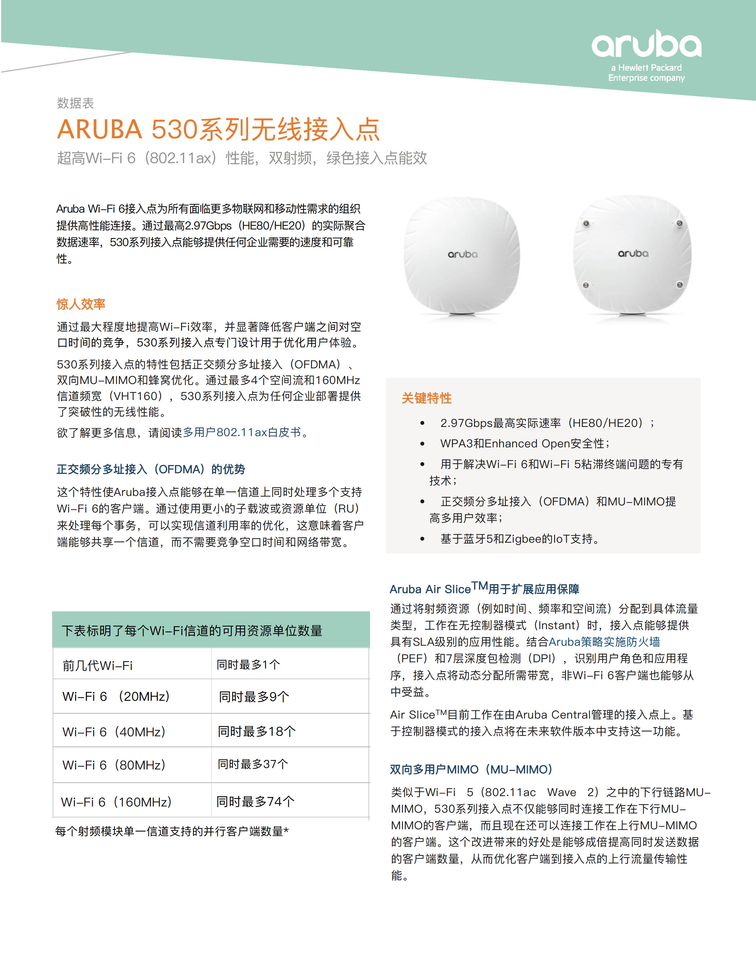 基于 Wi-Fi 6 标准构建的 530 系列接入点具有 OFDMA、双向 MU-MIMO 和目标唤醒时间等功能,可以获得更好的多用户性能并提高效率。