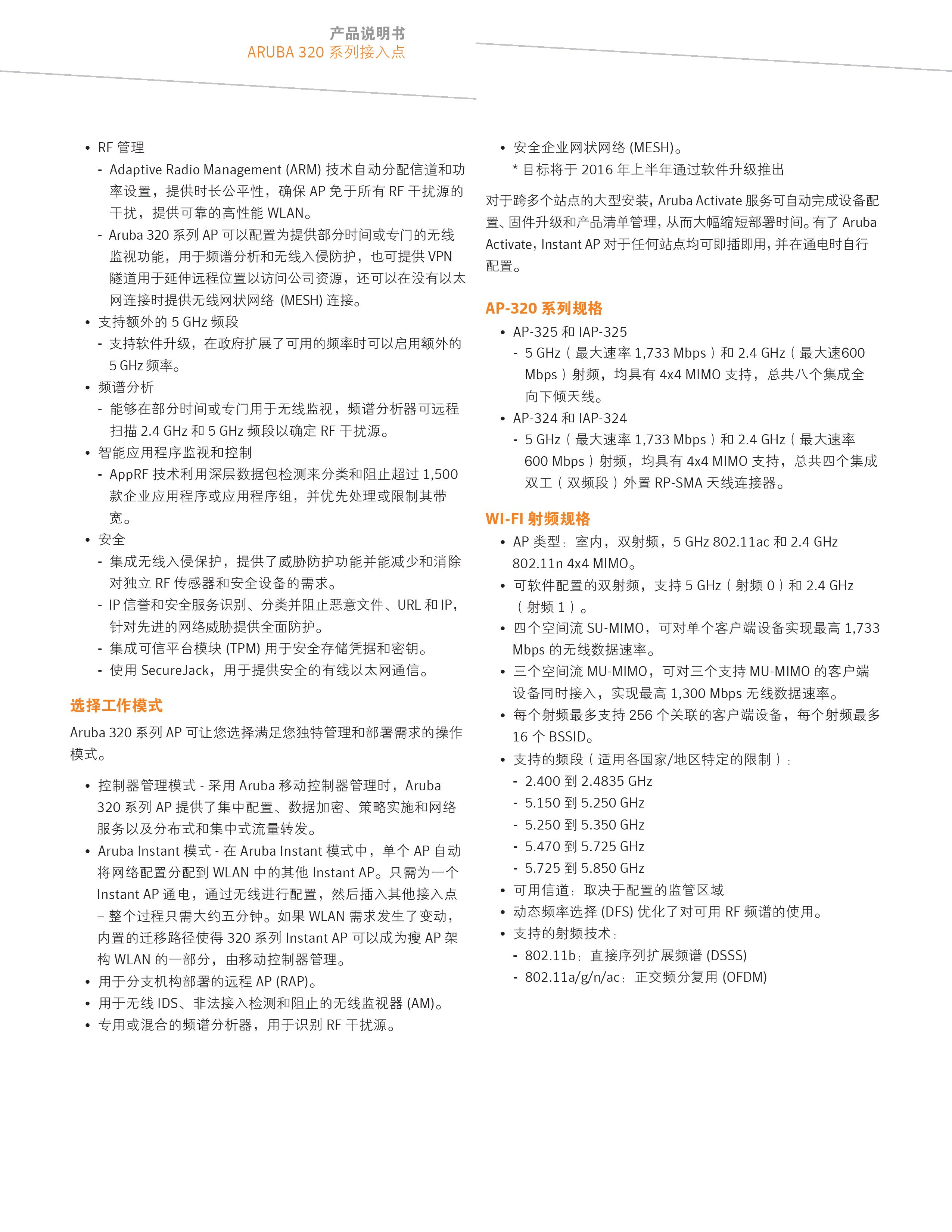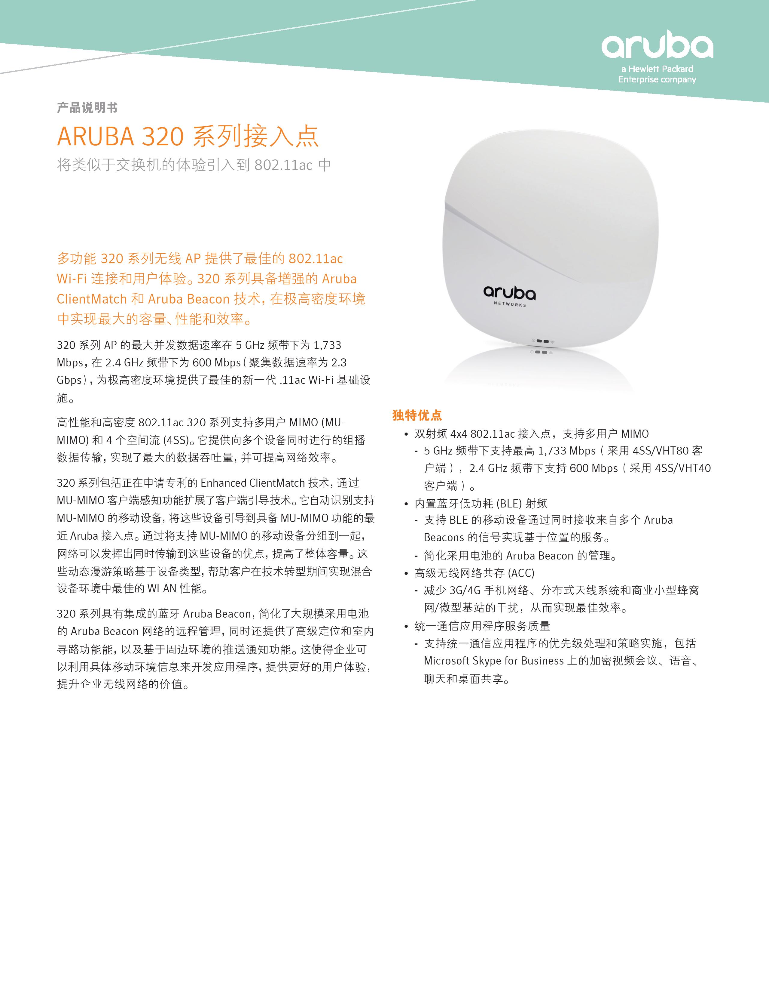 超快 320 系列 802.11ac 第二代 AP 在高密度环境中提供了最高的性能,可由移动AC管理,也可以部署在无AC Aruba Instant 模式下。这些第二代接入点提供了具备多用户 MIMO(MU-MIMO) 感知能力的 ClientMatch