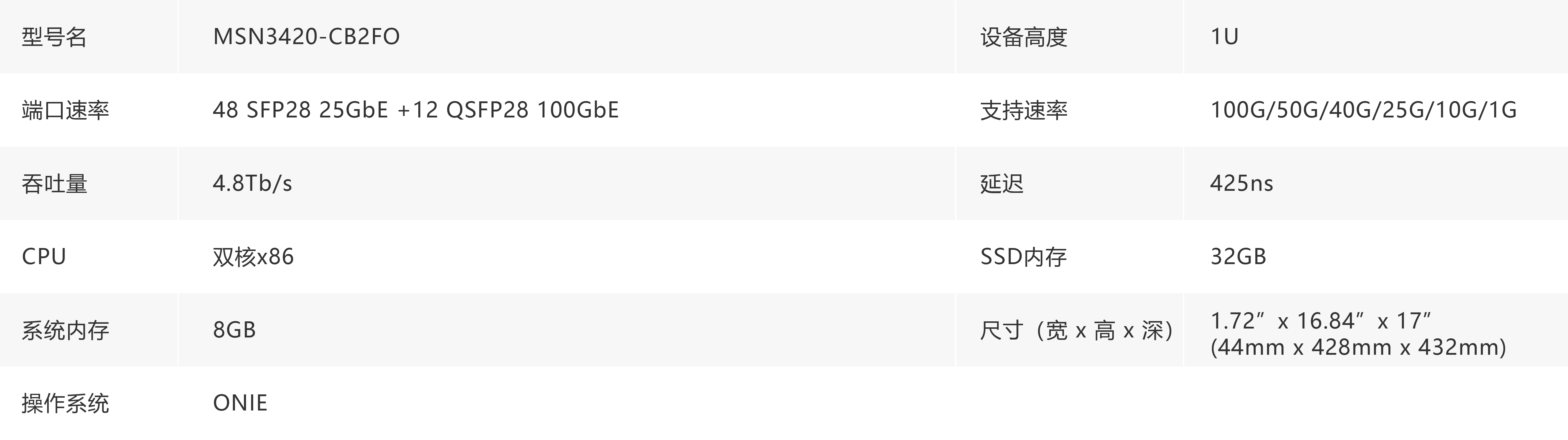 SN3420配备 48 个 10/25GbE 端口和 12 个高达 100GbE 的端口,可提供高达 4.8Tb/s 的总吞吐量和 3.58Bpps 的处理能力,提供了从 10G 演进到 25G的高性能、经济高效的方式,支持无缝使用 QSFP28 连接以实现叶脊拓扑和面向未来的数据中心,是一款理想的架顶式 (ToR) 网络交换机。