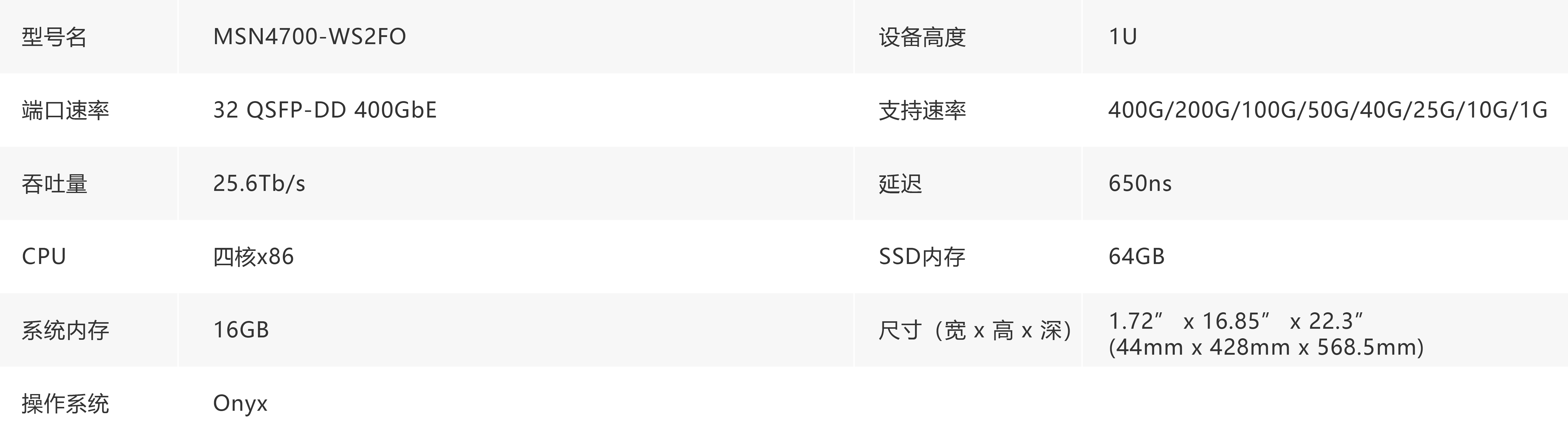 SN4700 骨干/超级骨干在紧凑的 1U 外形尺寸中提供 32 个 400GbE 端口。它能够以不同的速度连接到端点,并具有 25.6Tb/s 的吞吐量,以及8.4Bpps 处理能力。作为理想的主干解决方案,SN4700 具有最大的灵活性,每个端口的端口速度从 1GbE 到 400GbE。